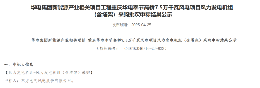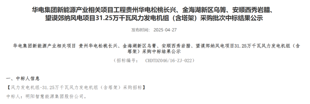 近日,华电集团电子商务平台发布重庆华电奉节高桥7.5万千瓦风电项目、黑龙江华电佳木斯汤原一期200MW风电项目、内蒙古华电孪井滩60万千瓦风光制氢一体化项目配套40万千瓦风电项目、云南华电红河开远大黑山扩建19.5万千瓦风电项目、黑龙江华电黑河北安建华20万千瓦风电项目、贵州华电松桃长兴、金海湖新区乌箐、安顺西秀岩腊、望谟郊纳风电项目31.25万千瓦、甘肃华电临夏州盐锅峡镇下铨村和通渭县孟河村、卢董村“千乡万村驭风行动”试点项目5万千瓦风力发电机组采购中标结果公示的公告。