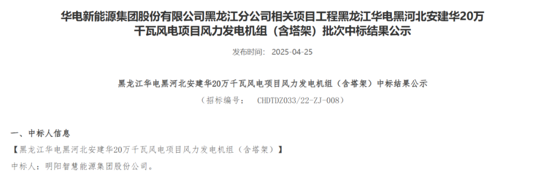 公告显示,明阳智慧能源集团股份公司成功中标该项目,中标价格为70750.000000万元。