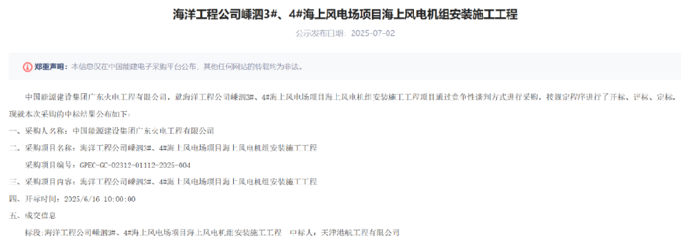 7月2日,中国能建电子采购平台发布《海洋工程公司嵊泗3#、4#海上风电场项目海上风电机组安装施工工程中标公示》的公告。