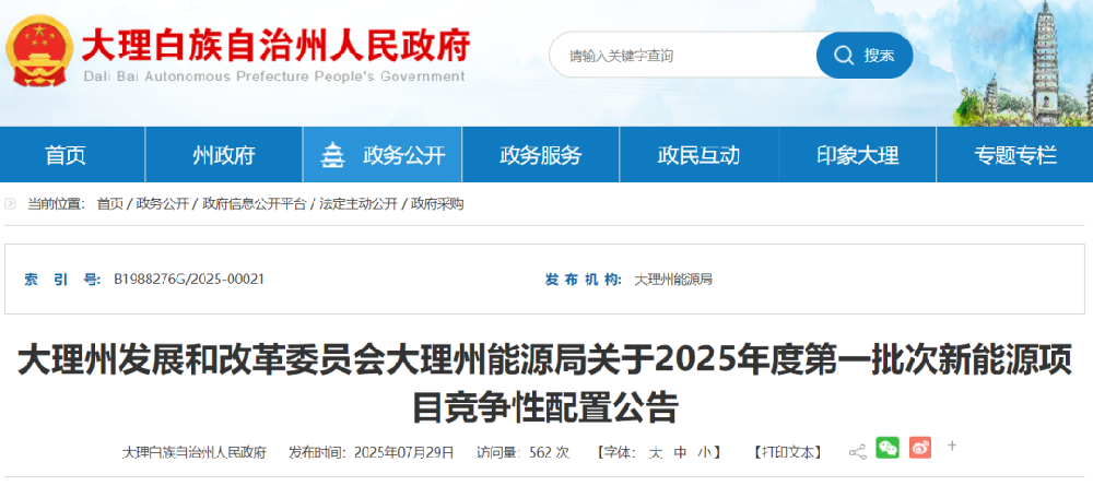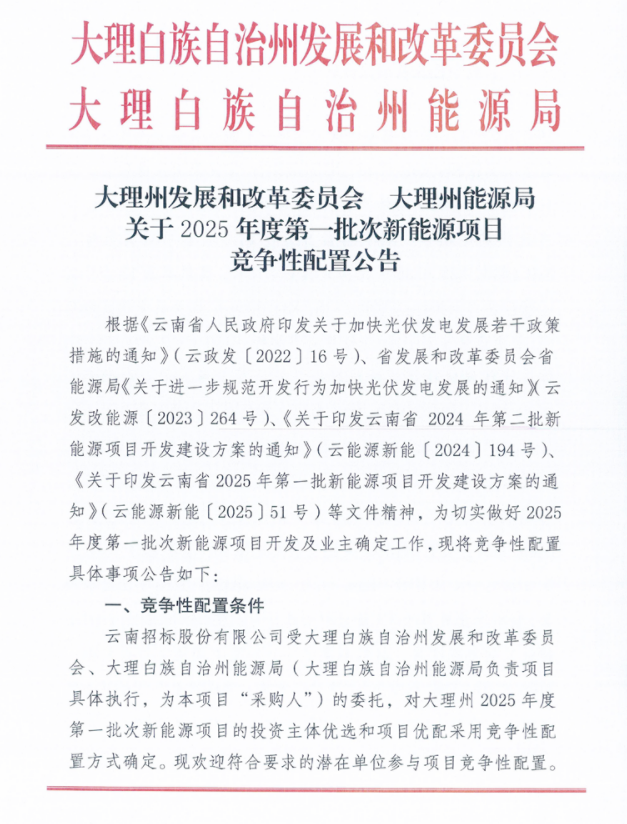 7月29日,云南省大理州发展和改革委员会 大理州能源局发布《关于2025年度第一批次新能源项目竞争性配置公告》。