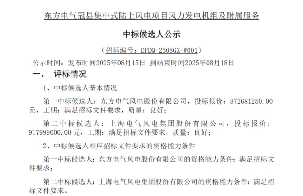 8月15日,大唐电子商务平台发布《东方电气冠县集中式陆上风电项目风力发电机组及附属服务中标候选人公示》的公告。